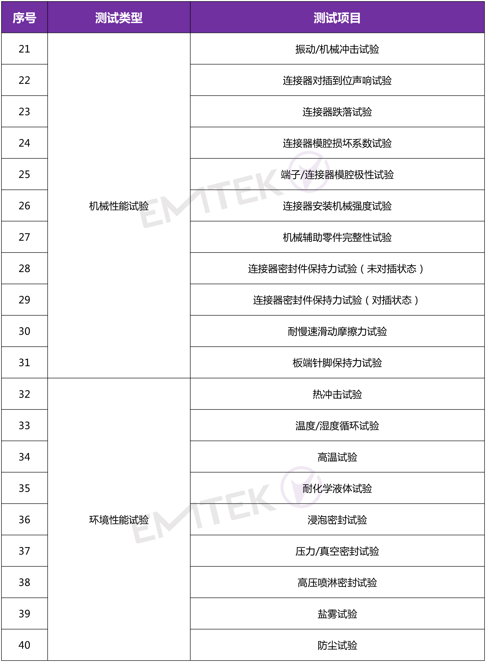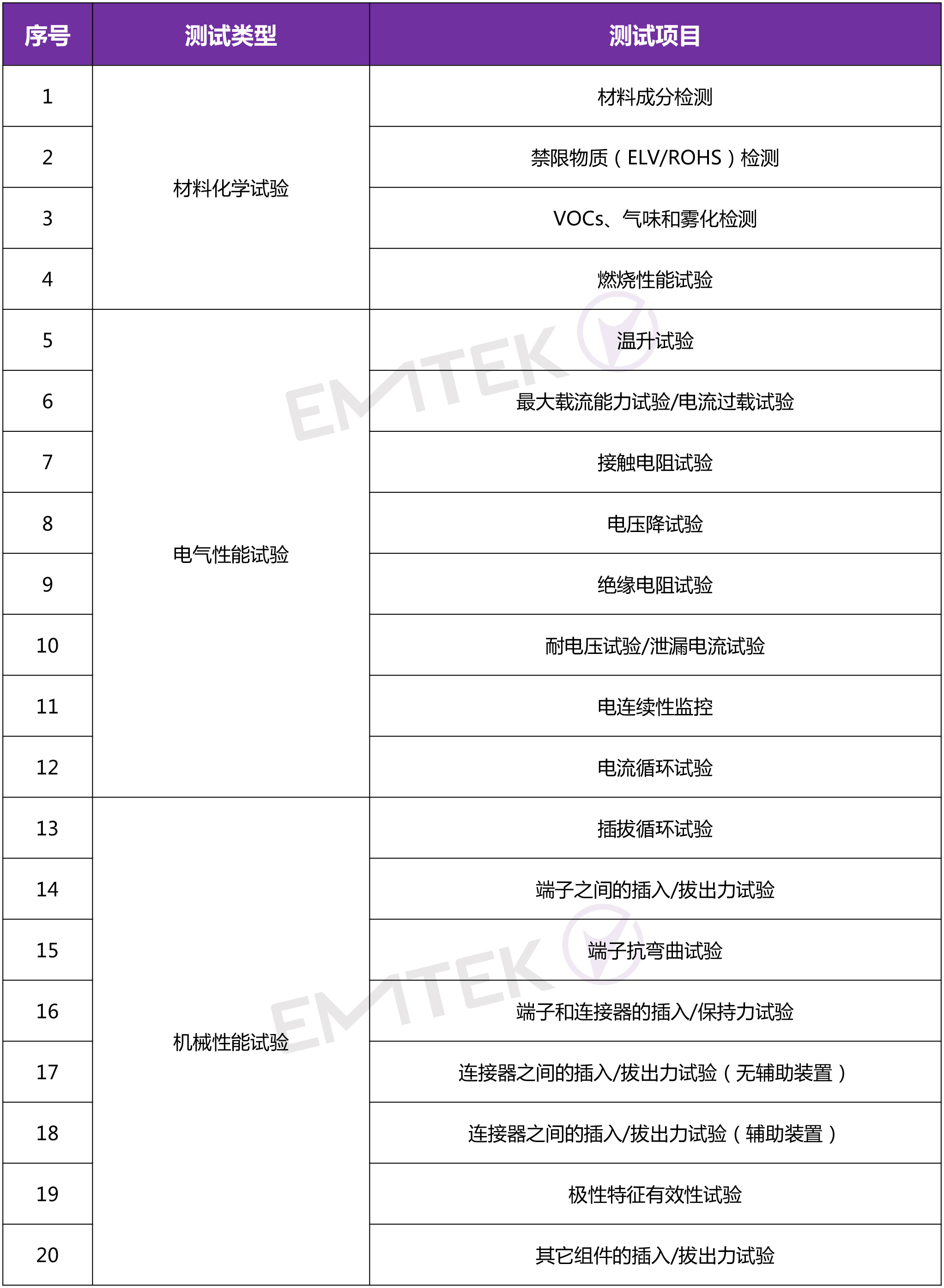 連接器等線束附件的測(cè)試包括材料化學(xué)、電氣性能、機(jī)械性能和環(huán)境性能試驗(yàn)。