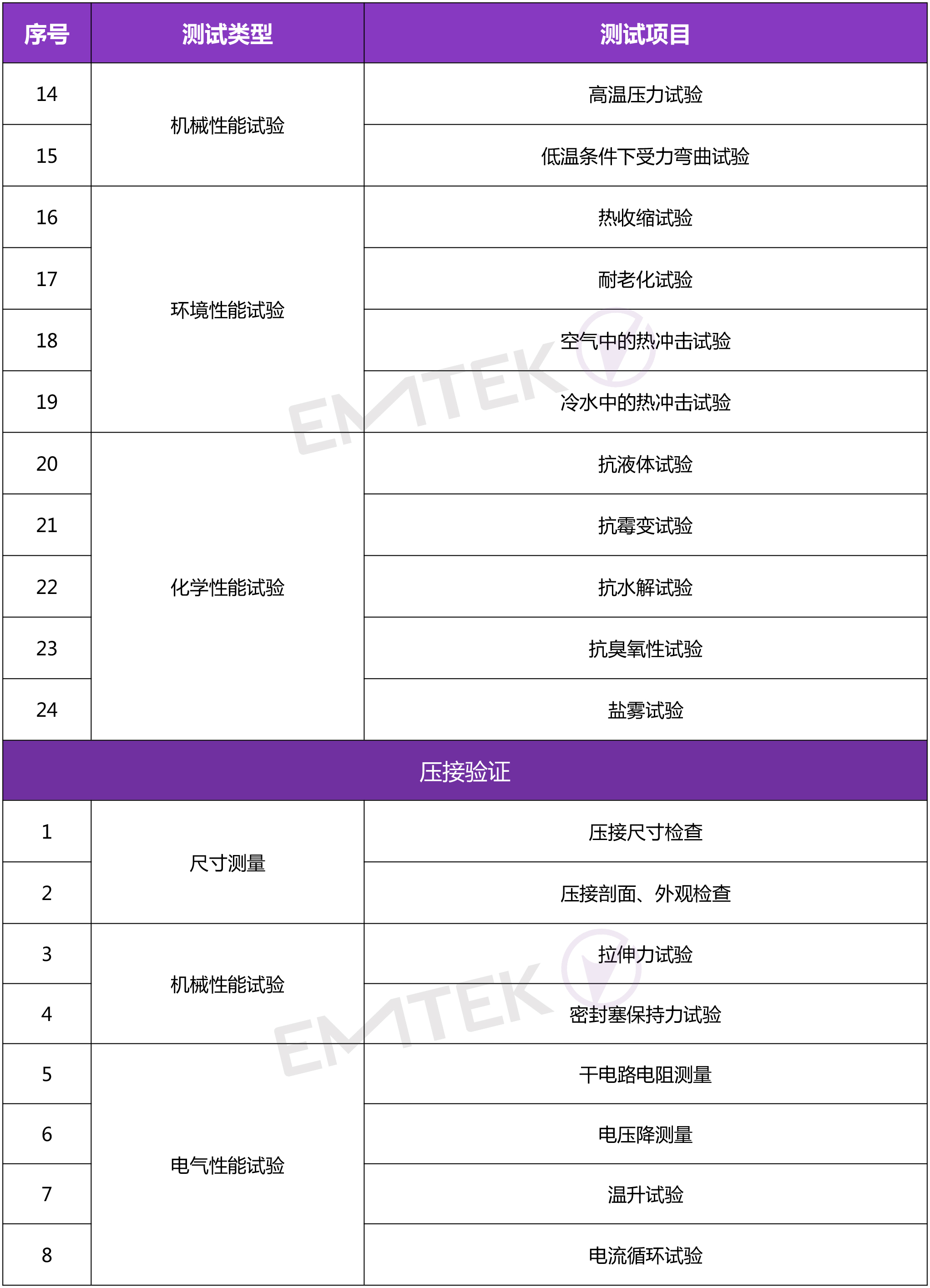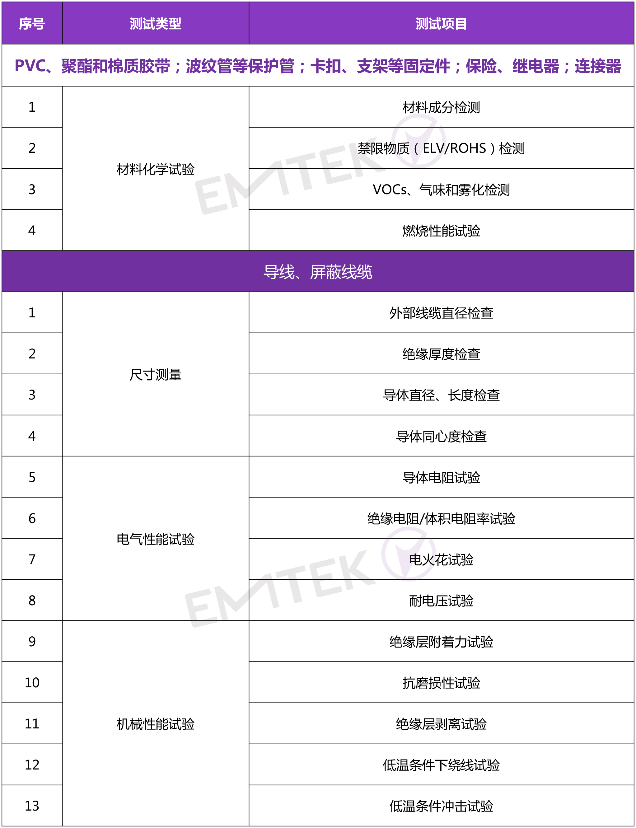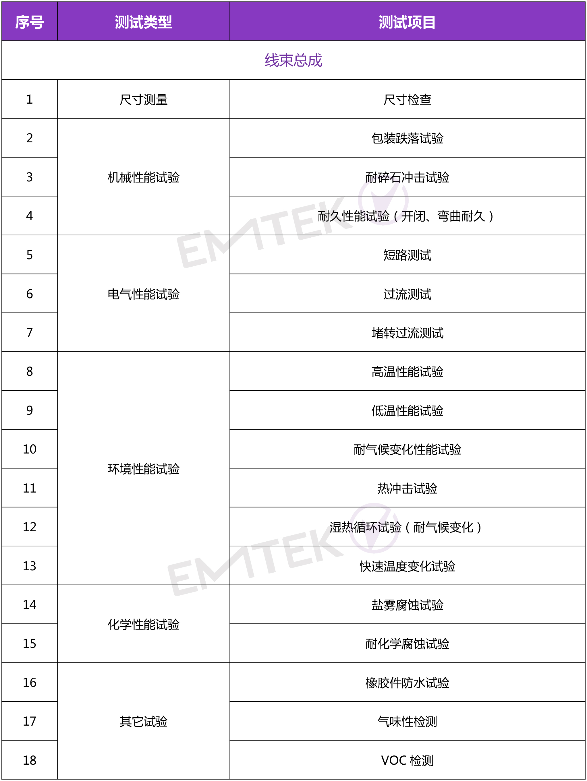汽車線束環(huán)境空間多樣,經(jīng)歷復(fù)雜的濕熱變化和振動變化。為確保線束功能可靠性,其材料選型和檢驗、產(chǎn)品設(shè)計和驗證、加工工藝設(shè)計和驗證有嚴(yán)苛的標(biāo)準(zhǔn)規(guī)范和驗證流程。典型的測試服務(wù)有ELV檢測、VOCs檢測,以及機械性能、電氣性能、環(huán)境氣候性能等可靠性檢測。