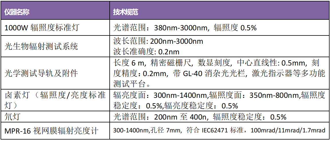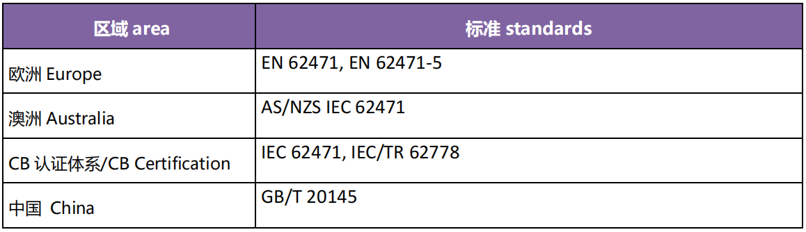 危害、視網膜藍光危害、視網膜熱危害、視網膜熱微弱危害。為評估燈和燈系統相關的光輻射危害,明確規定曝輻射限值,包括輻射照度,輻射亮度。根據測試數據對產品進行危害分級,包括豁免級,低危害,中等危害,高危害級別。