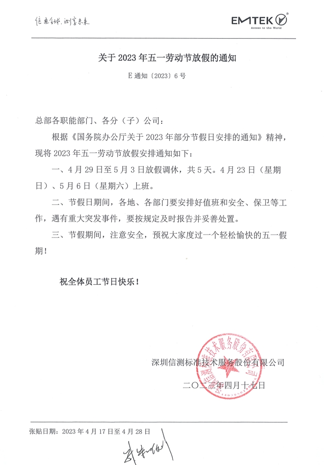 關于2023年五一勞動節放假的通知