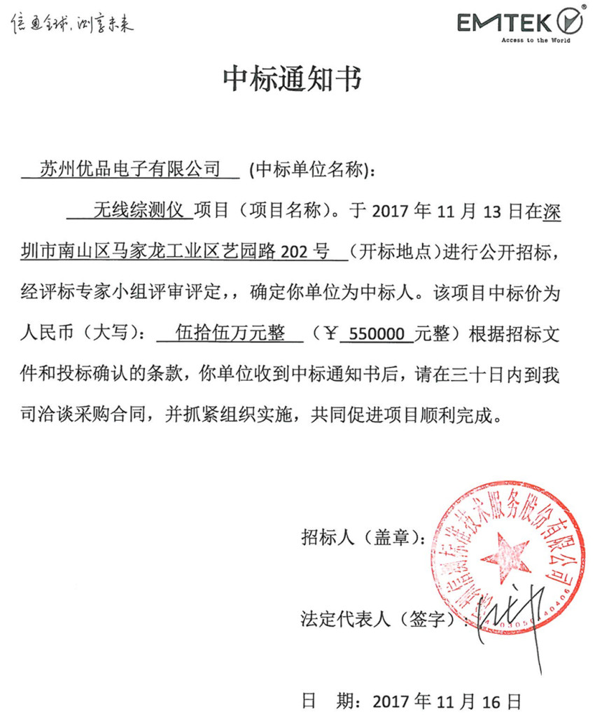 蘇州優品中標通知書
