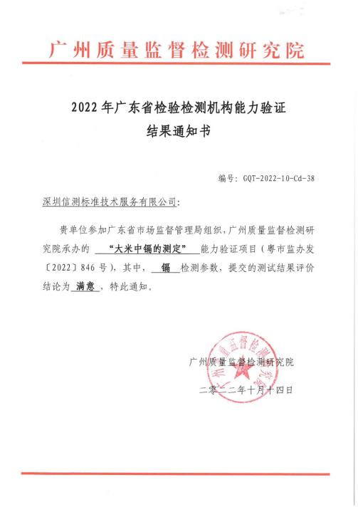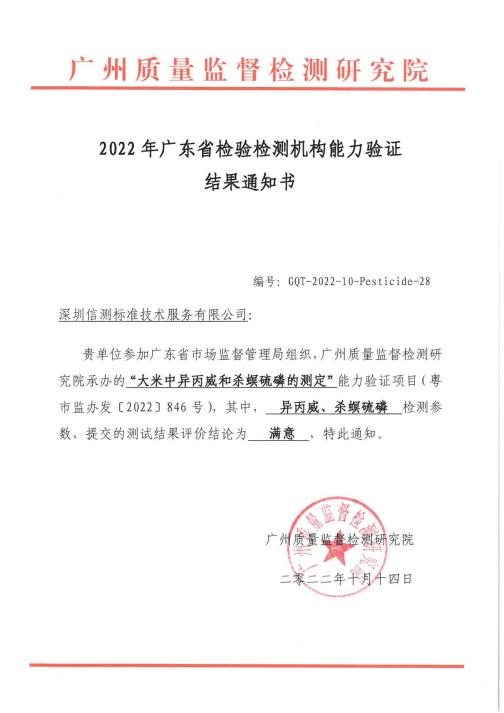 近日,在由廣東省市場監(jiān)督管理局組織、廣州質(zhì)量監(jiān)督檢測研究院承辦的“2022廣東省檢驗檢測機構(gòu)能力驗證”中,信測標準參加的“大米中鎘、異丙威和殺螟硫磷的測定”食品檢測領域3個能力驗證項目,均獲得“滿意”!