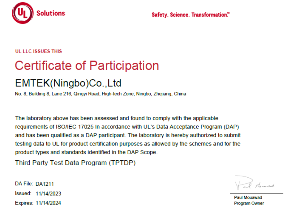 信測標準(寧波)公司長期以來同UL保持密切友好合作,是UL公司多標準TPTDP免目擊實驗室和WTDP目擊實驗室,為客戶縮短認證周期、節約差旅費/成本,更好體驗信測標準一站式、通全球的優質服務。