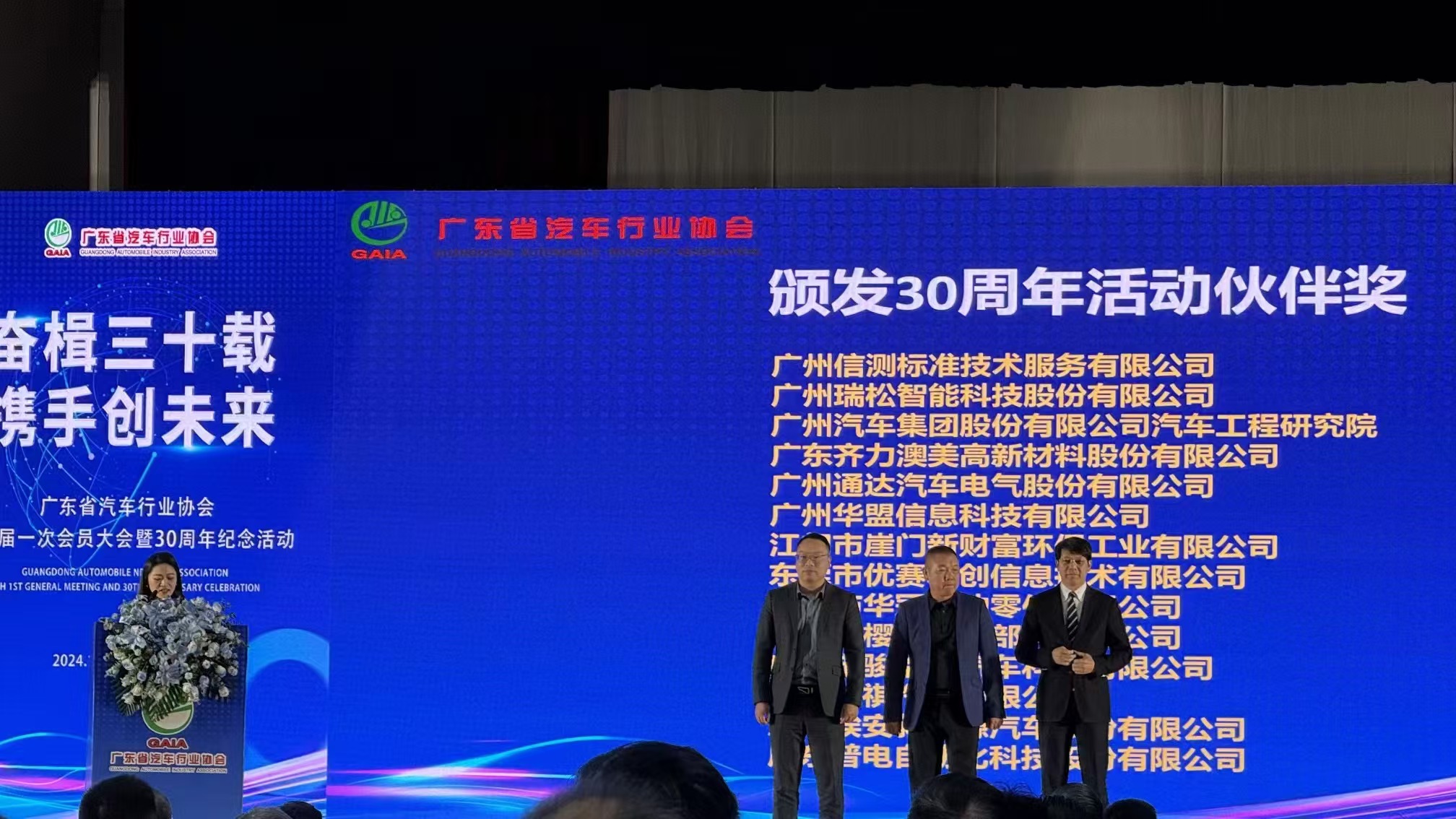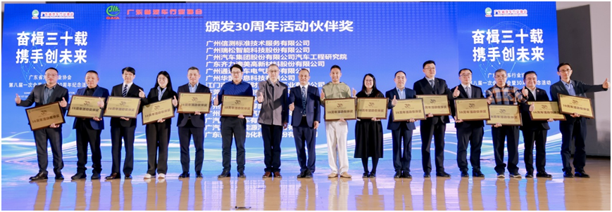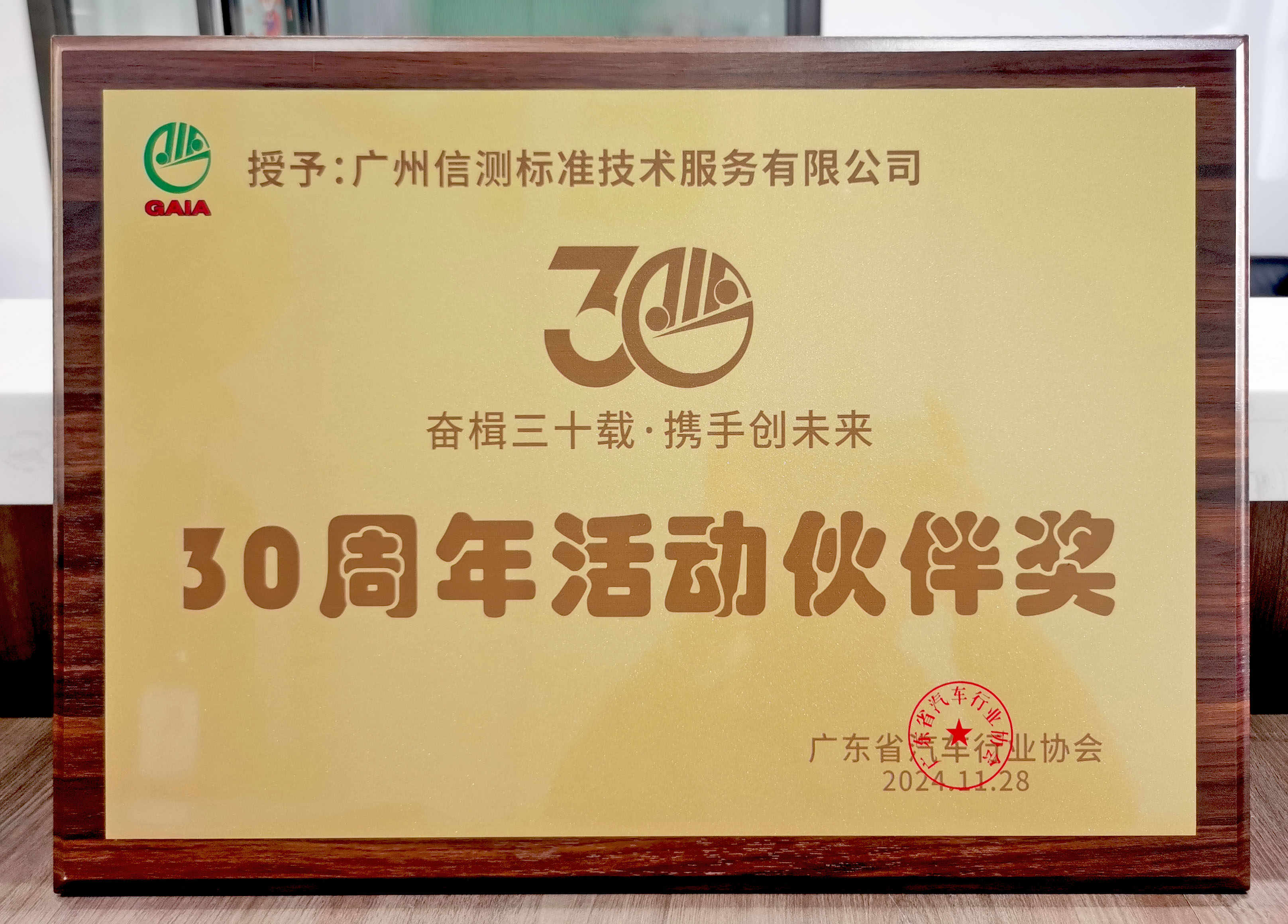 大會現場,信測標準獲頒30周年活動伙伴獎,并被授予了廣東省汽車行業協會第八屆理事會理事單位榮譽牌匾。這是對過去信測標準為廣東省汽車行業發展所做努力的認可和肯定,更是對未來信測標準助推汽車產業鏈及新能源產品檢驗檢測服務實現更高質量發展的期許。