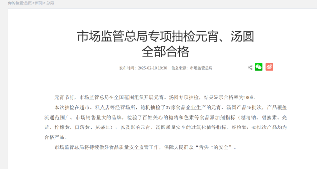 除了商家提供的合格檢測報告之外,根據(jù)市場監(jiān)管總局發(fā)文,市場監(jiān)管總局也在元宵節(jié)前在全國范圍組織開展了元宵、湯圓專項抽檢,結(jié)果顯示合格率為100%。這也給消費者們吃了一顆定心丸,大家可以放心的選購湯圓,過一個健康美味、歡樂祥和的元宵節(jié)!