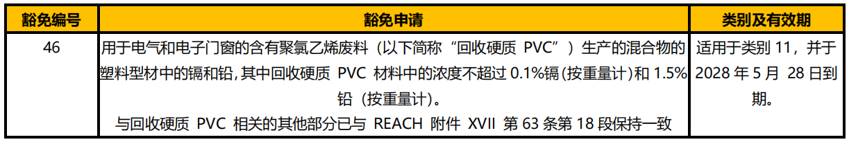 此外,該豁免的范圍與 REACH 附件 XVII 第 63 條中有關 PVC2 中鉛的規定對回收 PVC 中鉛的減損一致。因此,EC 已授予 RoHS 指令附件 I 第 11 類的豁免。表 A 豁免詳情。