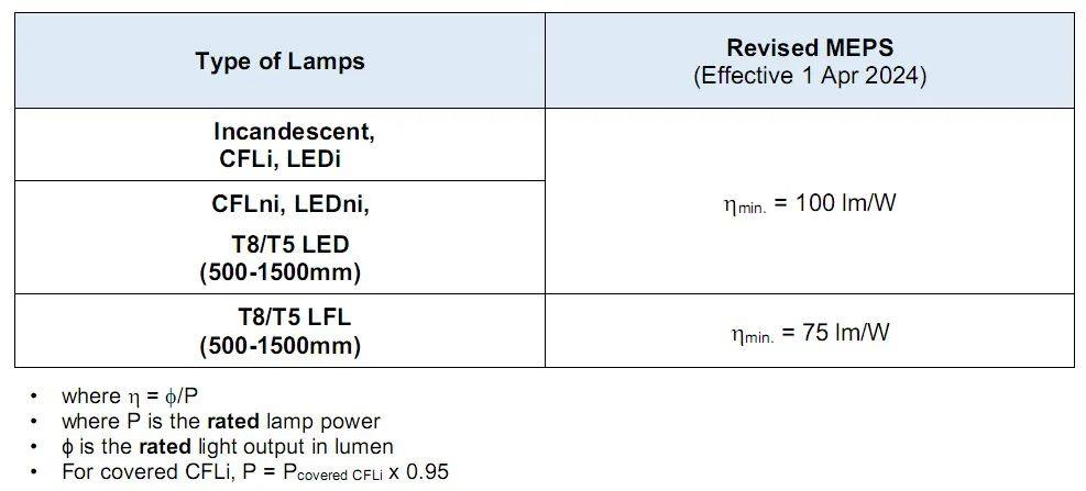 2024 年4 月 1 日起,新加坡 NEA 強制受管制的lamps 的能效更新要求如下: