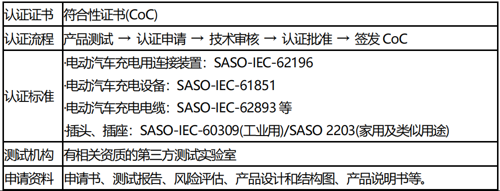 沙特阿拉伯為實(shí)現(xiàn)本國(guó)“2030 愿景”,減少碳排放,大力鼓勵(lì)電動(dòng)汽車產(chǎn)業(yè)的發(fā)展并支持投資電動(dòng)汽車基礎(chǔ)設(shè)施建設(shè),逐漸成為電動(dòng)汽車及充電設(shè)備企業(yè)出口新興潛力市場(chǎng)。2019 年以來(lái),沙特相繼發(fā)布了電動(dòng)汽車相關(guān)的技術(shù)法規(guī)以及電動(dòng)汽車充電設(shè)備認(rèn)證要求,以下為電動(dòng)汽車充電設(shè)備出口沙特阿拉伯的強(qiáng)制性認(rèn)證要求。