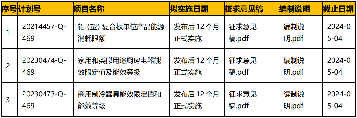 《商用制冷器具能效限定值和能效等級(jí)》等 3 項(xiàng)國(guó)家標(biāo)準(zhǔn)的征求意見(jiàn)稿,現(xiàn)公開(kāi)征求意見(jiàn)。請(qǐng)于2024年5月4日前將意見(jiàn)反饋給組織起草部門。