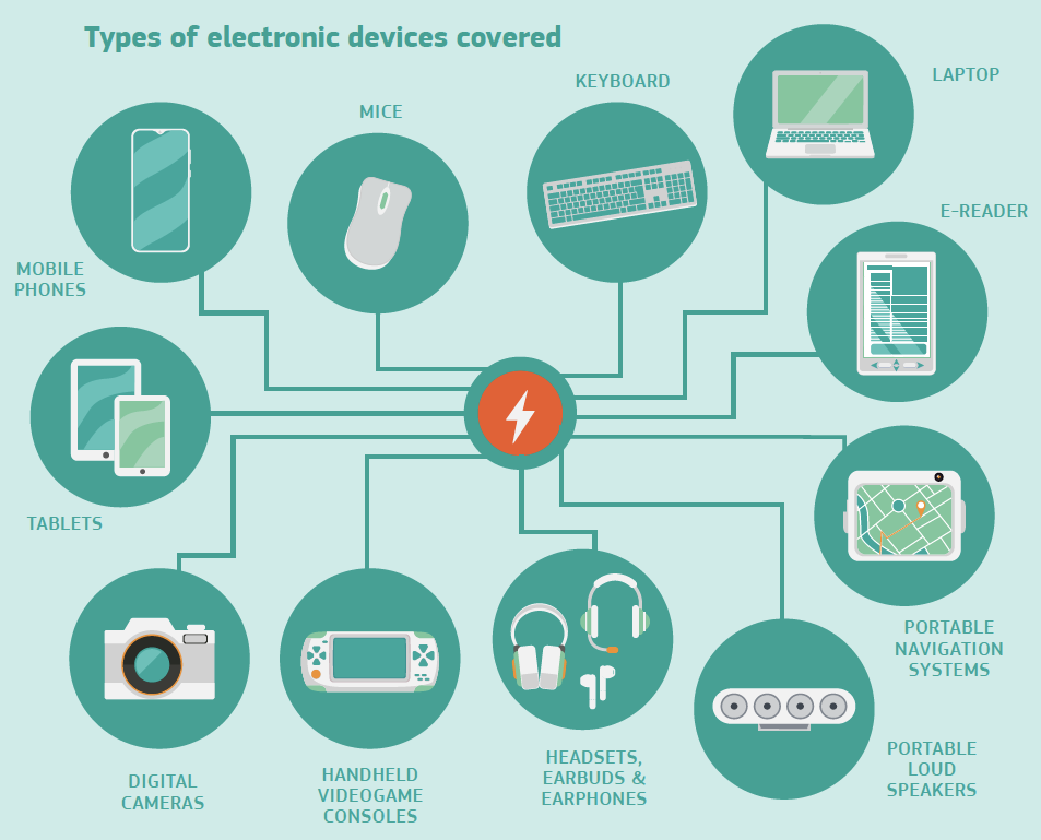 該修訂指令涵蓋手機、平板電腦、數碼相機、頭戴式耳機、帶麥克風的頭戴式耳機 、手持游戲機、便攜式揚聲器、電子書、鍵盤、鼠標、便攜導航、入耳式耳機及筆記本電腦等共13類無線設備。