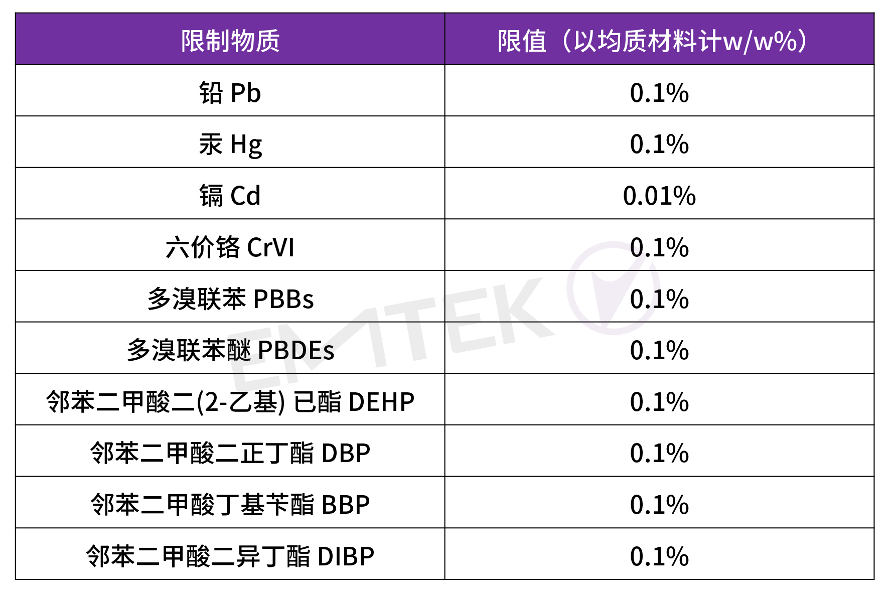 將鄰苯二甲酸二正丁酯(DBP)、鄰苯二甲酸二異丁酯(DIBP)、鄰苯二甲酸丁基芐酯(BBP)和鄰苯二甲酸二(2-乙基)己酯(DEHP)四項鄰苯二甲酸酯類物質納入標準的適用范圍,對這些限用物質進行管控,至此,中國RoHS將管控10項物質,與歐盟一致;