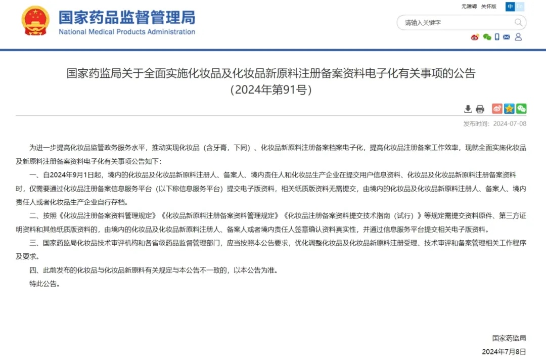 2024年7月8日,為進一步提高化妝品監管政務服務水平,國家藥監局發布《關于全面實施化妝品及化妝品新原料注冊備案資料電子化有關事項的公告》(2024年第91號)。