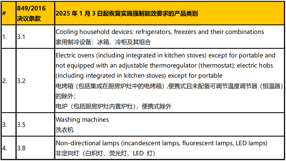 根據(jù)白俄羅斯部長理事會 2024 年 9 月 26 日第 708 號決議,白俄羅斯針對 2016 年 10 月 21 日發(fā)布的第849 號決議中列出的部分(四類)使用能源的電器產(chǎn)品將恢復(fù)實(shí)施強(qiáng)制性能源效率/能效標(biāo)簽要求,強(qiáng)制實(shí)施日期為 2025 年 1 月 3 日。