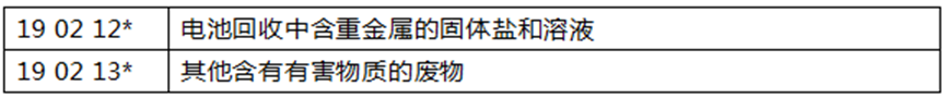(4)關(guān)于 19 02 廢物物理/化學(xué)處理(包括脫鉻、脫氰、中和)產(chǎn)生的廢物新增了電池回收中含重金屬的固體鹽和溶液等。條目 19 02 11*已刪除,插入以下條目: