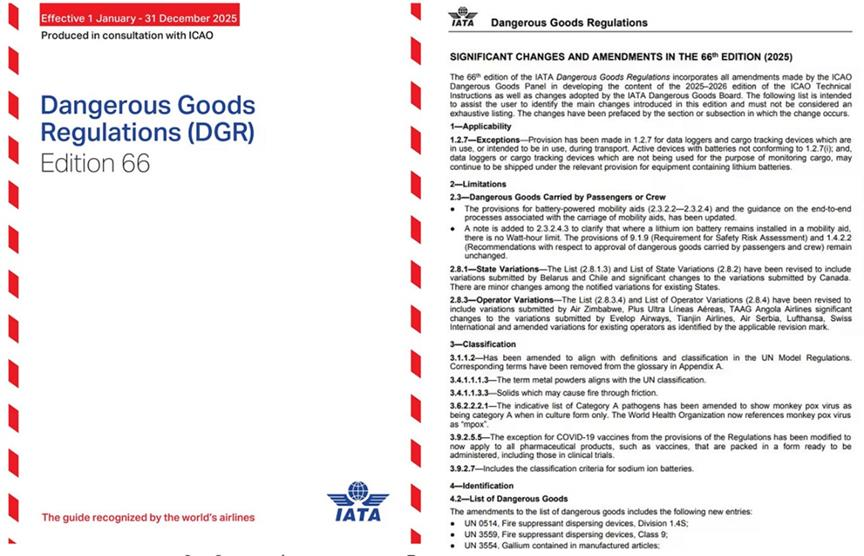 2024 年 10 月,國際航空運輸協(xié)會(IATA)發(fā)布了第 66 版 DGR(危險品規(guī)則),從 2025 年 1 月 1 日起,第 66 版 IATA 危險品條例(DGR)和第 12 版鋰電池運輸條例(LBSR)正式生效。