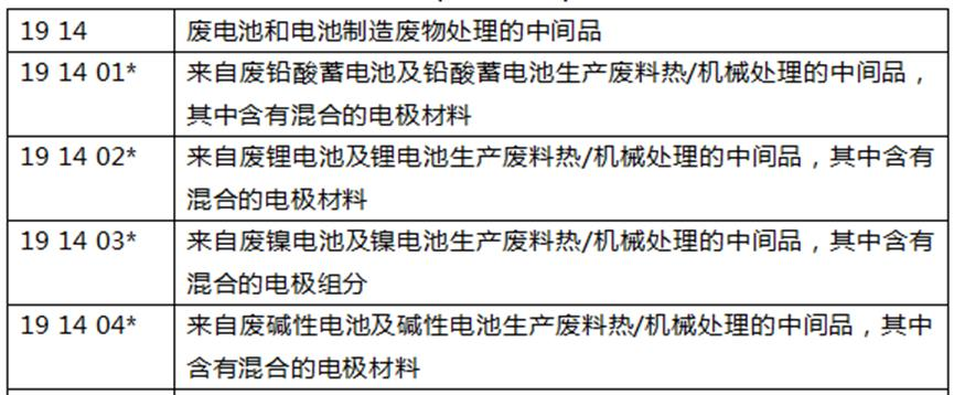 (5)新增廢電池和電池制造廢物處理產(chǎn)生的中間品,涉及廢鉛酸蓄電池、廢鋰電池、廢鎳電池、廢堿性電池等處理產(chǎn)生的中間品。在條目 19 13 08 之后插入以下條目(部分示例):