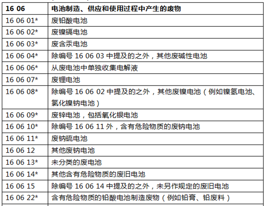 (3)關(guān)于 16 06 電池和蓄電池,將“電池和蓄電池”改為“電池制造、供應(yīng)和使用過程中產(chǎn)生的廢物”,同時將原來的 6 種物質(zhì)擴展到 35 種,且多為危險廢物。其中廢鋰電池、廢鋅電池、廢鈉電池均被列為危險廢物。替換內(nèi)容如下(部分示例):