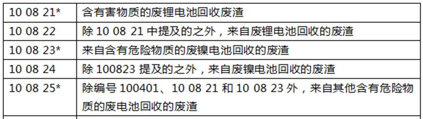 (2)關(guān)于 10 熱處理產(chǎn)生的廢物,對廢舊電池回收過程中所產(chǎn)生的廢渣進(jìn)行了修訂,具體包括修改了子編號 08 其他有色金屬熱冶金廢物下的相關(guān)內(nèi)容,增加了廢鋰電池、廢鎳電池等回收所產(chǎn)生的廢渣。在條目 10 08 20 之后插入以下條目(部分示例)