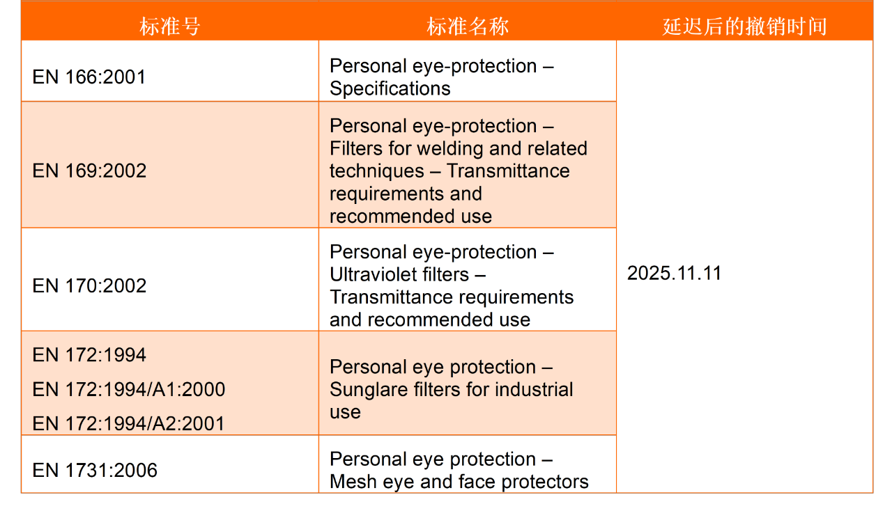 按實施決定(EU)2023/941,舊版本的協(xié)調(diào)標(biāo)準(zhǔn)原計劃在 2024 年 11 月被撤銷。由于新標(biāo)準(zhǔn)提出了較多新的技術(shù)要求,為給制造商足夠的時間調(diào)整,實施決定(EU)2024/2599 對部分協(xié)調(diào)標(biāo)準(zhǔn)的撤銷日期進(jìn)行延遲,其中包括 EN 166、EN 169、EN 170、EN 172 和 EN 379 等關(guān)于眼部和面部防護(hù)的標(biāo)準(zhǔn)。意味著制造商將有1年額外的時間來適應(yīng)新的標(biāo)準(zhǔn),并可以在 2025 年 11 月前依然按照舊版標(biāo)準(zhǔn)的相關(guān)要求進(jìn)行產(chǎn)品型式測試并申請 CE 認(rèn)證。
