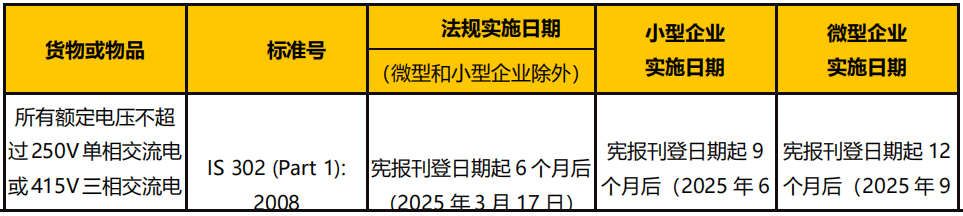 2024 年 9 月 17 日,印度標(biāo)準(zhǔn)局發(fā)布《家用及商用類似電器(質(zhì)量控制)令》,該法令適用于額定電壓不超過 250V 單相交流電或 415V 三相交流電的家用、商用或類似用途的電器;該法令自官方公報公布之日起生效。
