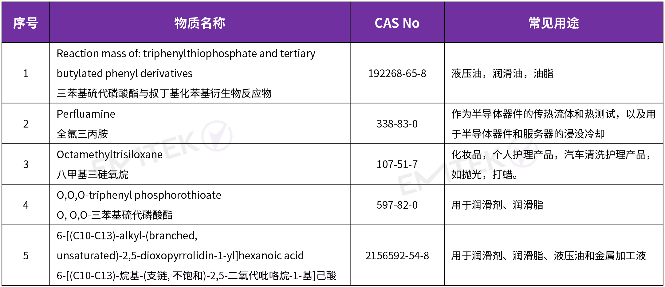 2025年1月21日,歐洲化學(xué)品管理局(ECHA)正式將下面5項(xiàng)物質(zhì)納入SVHC物質(zhì)清單。至此,SVHC物質(zhì)清單由原來(lái)的242項(xiàng)增加至247項(xiàng)。