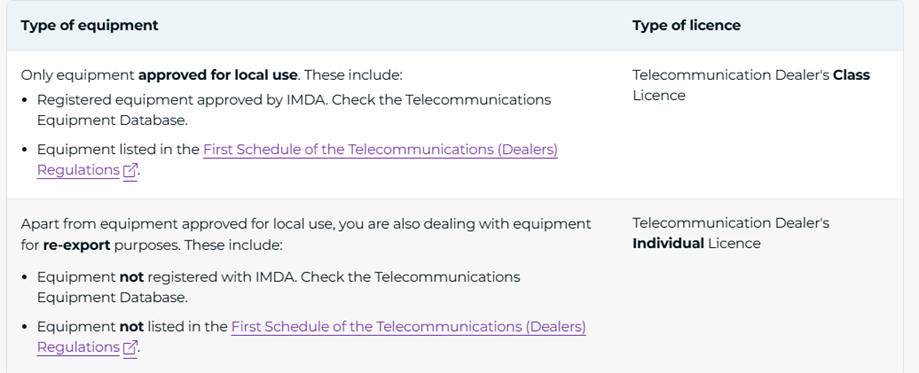 除非事先獲得IMDA的批準,否則不得進口或再出口違禁設備。請致信 info@imda.gov.sg
