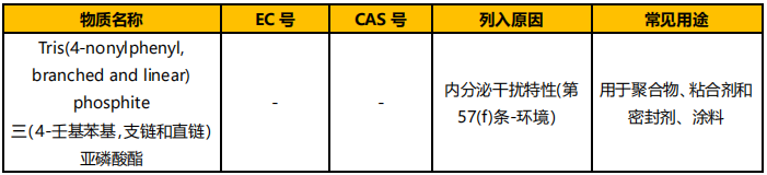 此外,ECHA 還更新了之前列入 SVHC 清單的第 21 批物質“三(4-壬基苯基,支鏈和直鏈)亞磷酸酯(TNPP)其中 4-壬基苯酚(支鏈和直鏈)(4-NP)含量大于等于 0.1%”的條目。