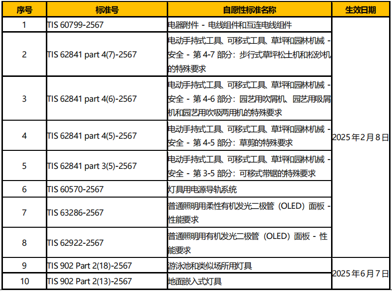 泰國工業標準協會(TISI)于 2025 年2 月 7 日更新TIS 標準清單,新增多項自愿性標準,見表 3。