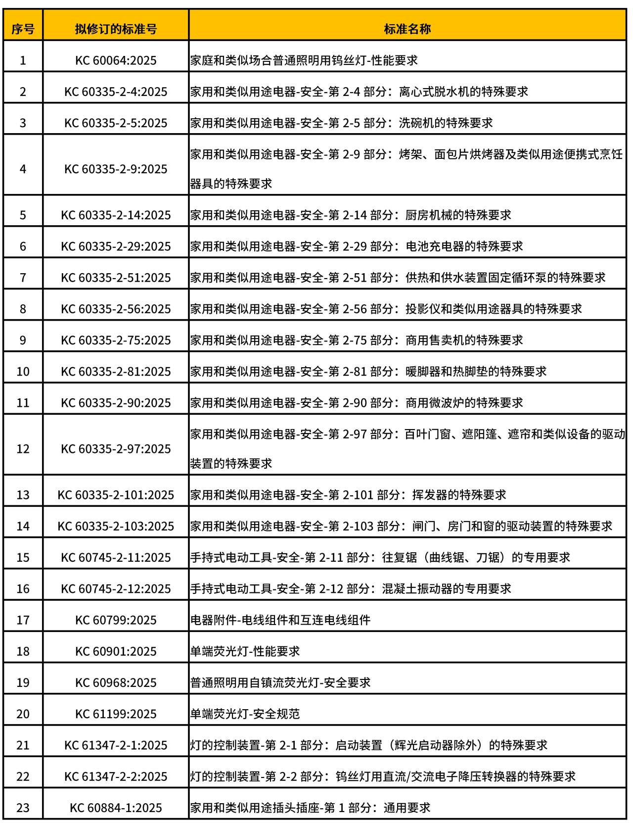本次修訂范圍廣泛,涵蓋了 KC 系列標準中的 23 個重要類別,見表 1,包括 KC 60332 系列、KC 60745系列等多個關鍵電器安全標準。修訂內容主要集中在三個方面:一是對技術要求進行更新,重點改進產品材料、結構和安全性能指標;二是對測試方法進行優化和補充,確保評估更加準確;三是針對特定產品的分類和適用范圍進行調整,使標準更具針對性。