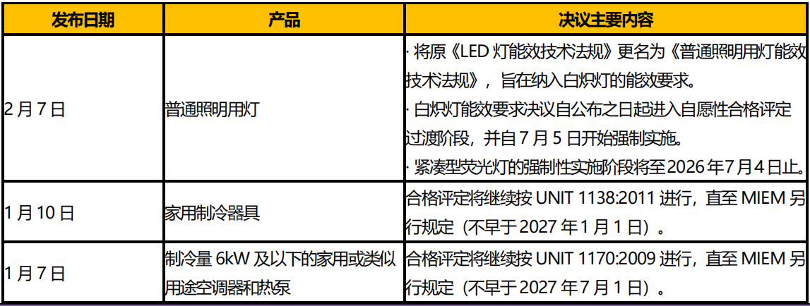 烏拉圭工業、能源與礦業部(MIEM)于2025 年1 月以來發布多項能效要求相關決議,見表2。