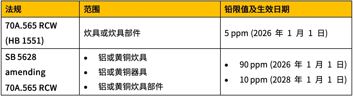 在2024年3月28日,美國華盛頓州通過了HB 1551法案(編纂為 70A.565 RCW),限制炊具或炊具組件中的鉛或鉛化合物含量不得超過5ppm, 且該限制將于2026年1月1日生效。