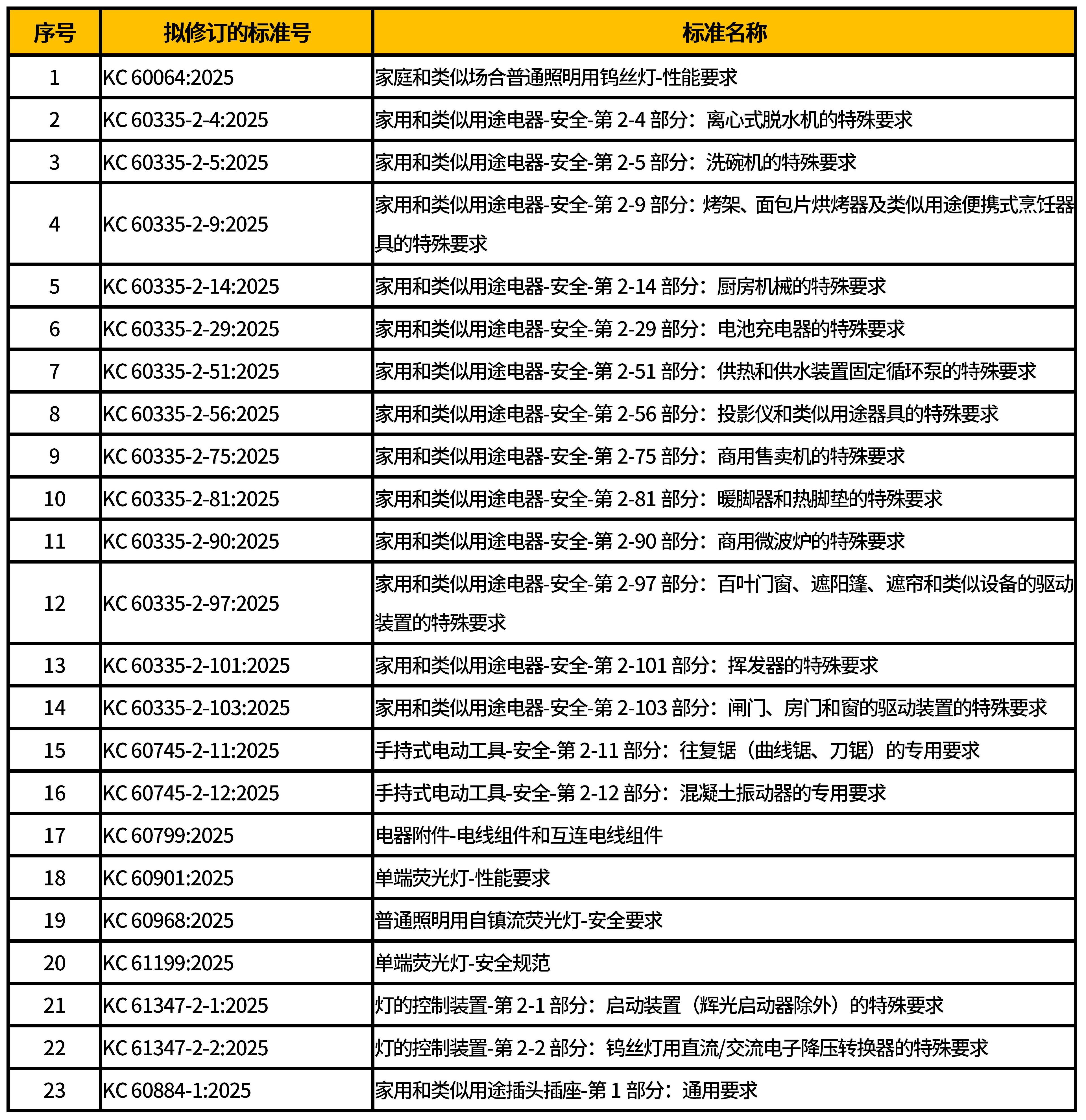 韓國國家標(biāo)準(zhǔn)技術(shù)研究院(KATS)于2025年5月22日發(fā)布公告,宣布修訂23項(xiàng)電氣安全標(biāo)準(zhǔn),見表 1。新版標(biāo)準(zhǔn)自發(fā)布之日起生效,舊版標(biāo)準(zhǔn)仍可適用至2026年5月22日。