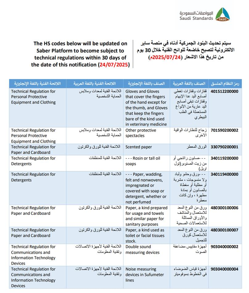 2025 年 7 月,沙特阿拉伯標準組織 SASO(Saudi Standards, Metrology and Quality Organization)發布通知,宣布部分產品將在該通知發布日期(2025 年 7 月 24 日)的 30 天內被納入管控清單。自生效之日起,相關產品須符合相應的技術法規要求。