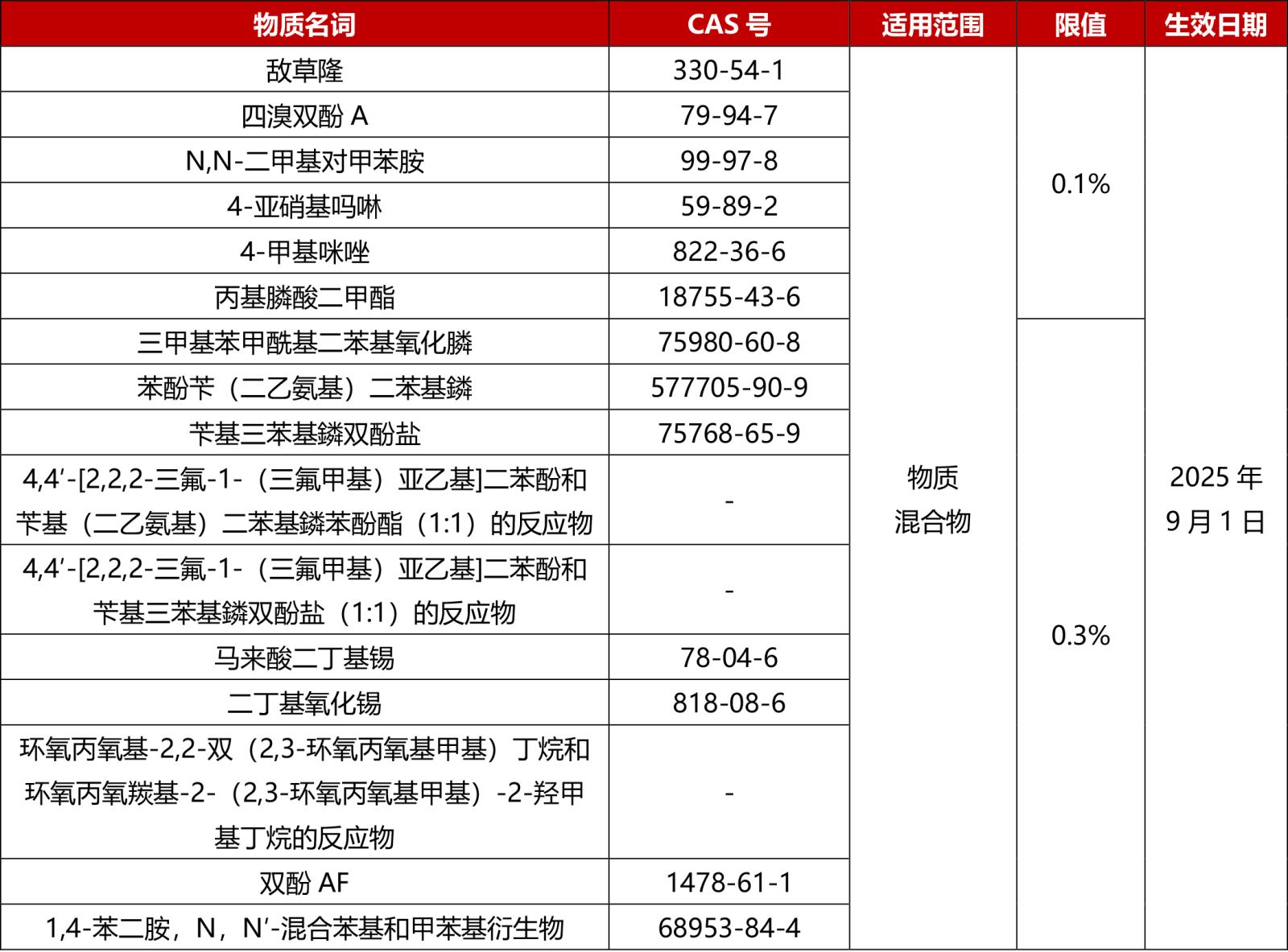 2025年9月1日,歐洲化學品管理局(ECHA)對3項SVHC意向物質展開公眾咨詢。公眾咨詢將于2025年10月16日結束,在公眾咨詢期結束前,各利益相關方均可向ECHA提交評議意見,ECHA將對反饋意見進行評議,通過評議的物質將被正式加入SVHC候選物質清單。