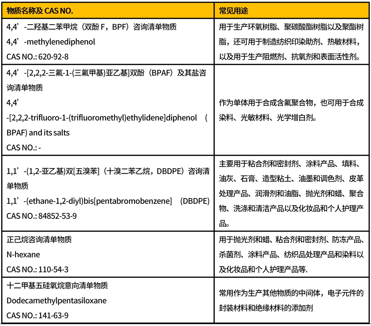 目前,SVHC咨詢清單物質共4項,意向清單物質1項,清單如下表: